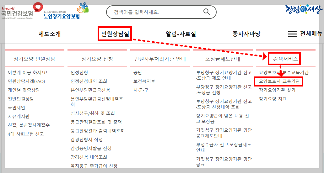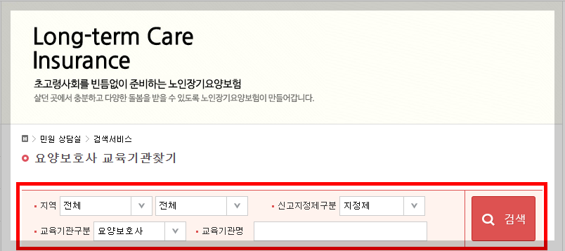 - ‘민원상담실’ → ‘검색서비스’ → ‘요양보호사 교육기관’ 메뉴에서