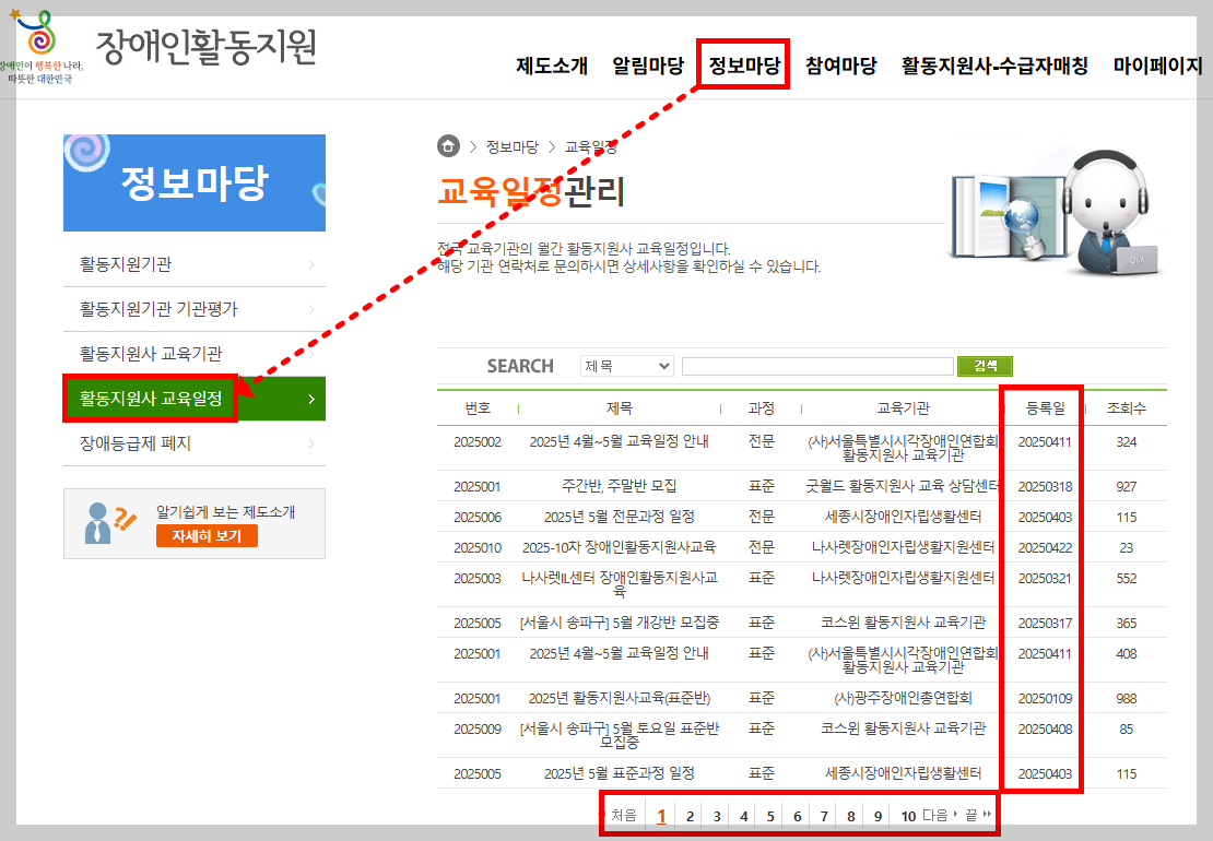 👉 장애인활동지원 홈페이지 → 상단 메뉴 ‘정보마당’ → ‘활동지원사 교육일정’ 클릭